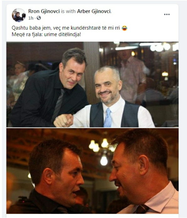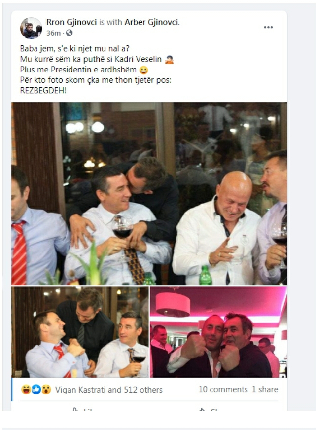 Në fotot e publikuara nga Gjinovci në Facebook, babai i tij, Arbër Gjinovci, shihet në prani të Kadri Veselit, Ramush Haradinajt, Hajredin Kuçit e Edi Ramës.