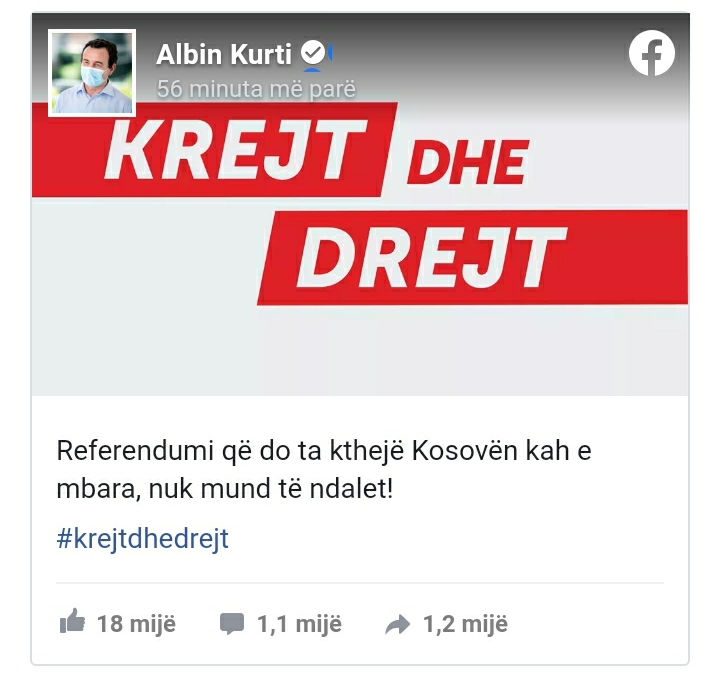 “Referendumi që do ta kthejë Kosovën kah e mbara, nuk mund të ndalet”, ka thënë ai në shkrimin e bërë në Facebook.