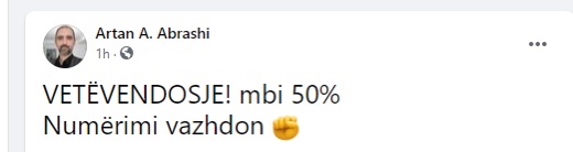 “Vetëvendosje! mbi 50% Numërimi vazhdon”, ka shkruar Abrashi.