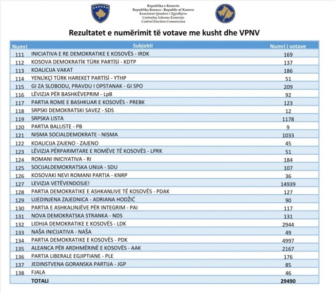 Vetëvendosje ka marrë 14 mijë e 939 vota nga gjithsej 29 mijë 490