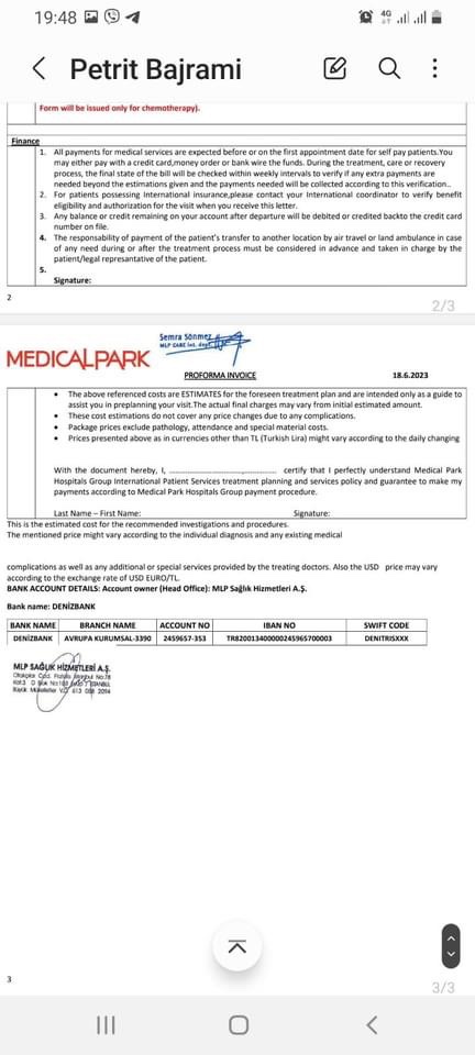 Shërimi i Petritit nuk mund të bëhet në Kosovë, si opsion është shteti i Truqisë në spitalin MEDICALPARK në Stamboll. Në bazë të profakturës kostoja e shërimit të Petritit sillet mbi 100,000.0 Euro- dëshmia e profaturës.