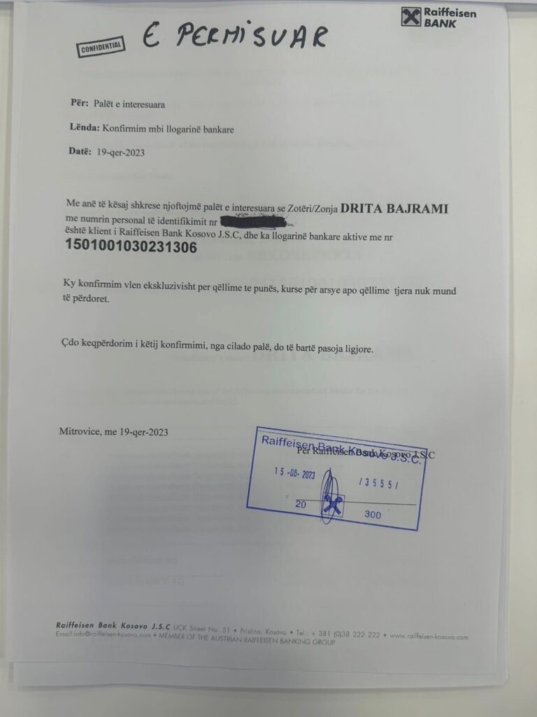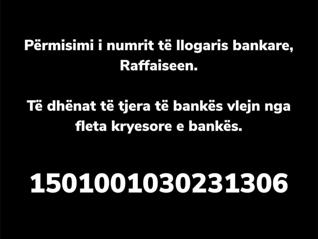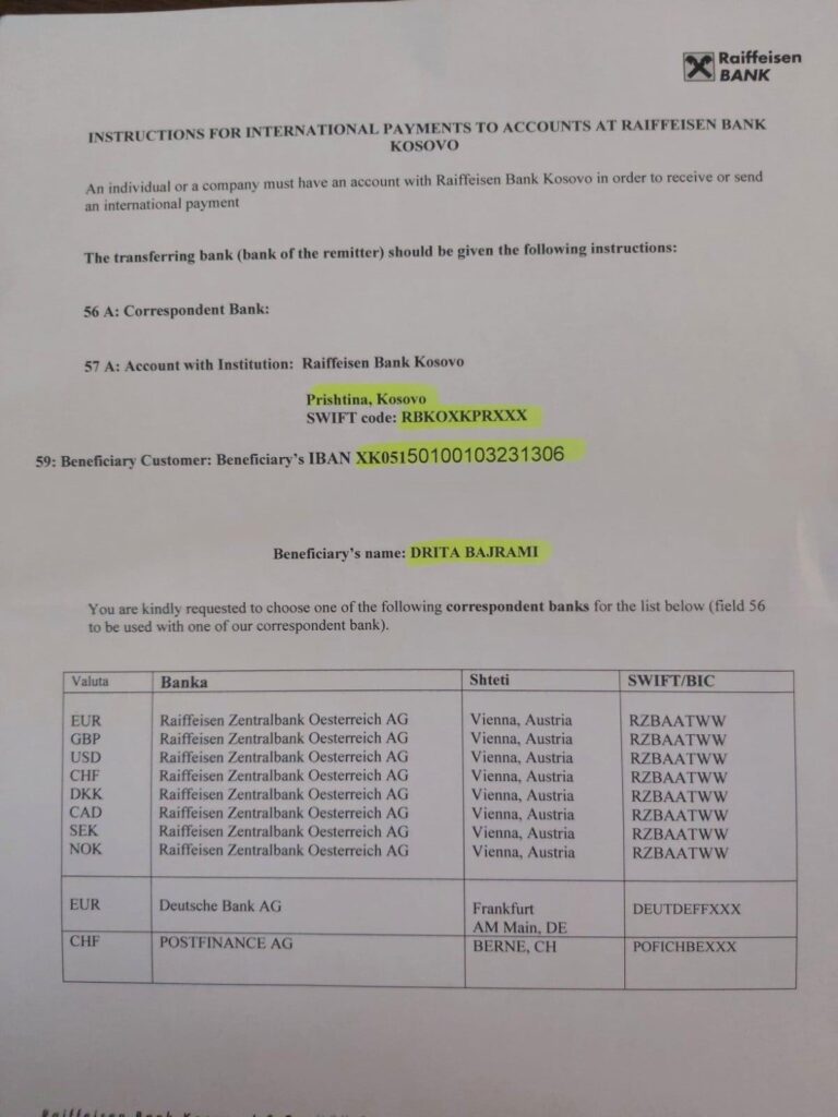 Për transfere bankare e keni në dispozicion llogarinë bankare të bashkëshortës së Petritit zonj. DRITA BAJRAMI, të gjitha të dhënat zyrtare të bankës për transfere nga brenda dhe jashtë Kosovës i keni në foto.