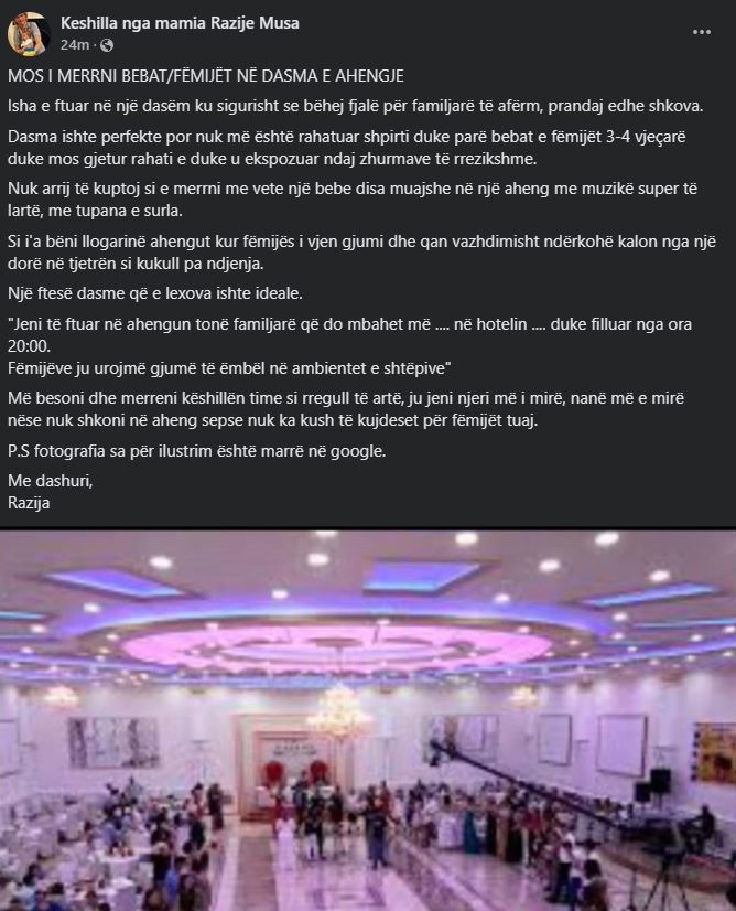 Ajo tha se fëmijeve iu vie gjum dhe qanjë vazhdimisht gjatë ahengut, derisa shtoi se nëse nuk ka kush të kujdeset për fëmijet mos shkoni në aheng.