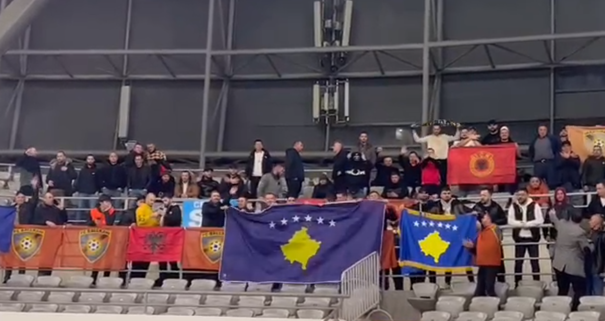 Tifozët shqiptarë, në shkallët e stadiumit kanë ngritur flamurin e Kosovës, flamurin e Shqipërisë, e po ashtu edhe flamurin e UÇK-së.