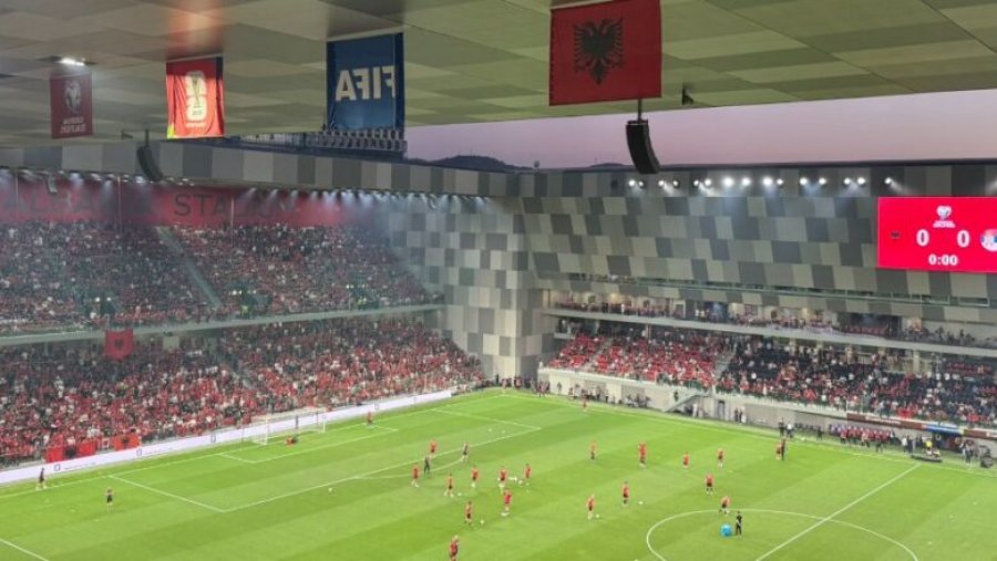 Atmosfera në stadiumin “Air Albania” në Tiranë është elektrizuese, teksa po afrohet fillimi i ndeshjes mes Shqipërisë dhe Serbisë.
