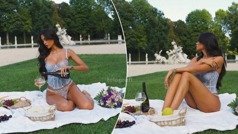 Modelja shqiptare, Jori Delli, ka ndarë me ndjekësit një seri fotografish ku shfaqet në një ambient të hapur, duke pozuar mbi një batanije të bardhë me verë, fruta dhe lule anash.