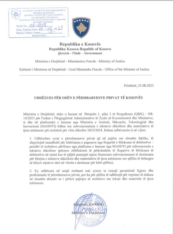 “Ministria e Drejtësisë, duke u bazuar në Shtojcën 1, pika 3 te Rregullores (QRK) – NR. 14/2023 per Fushat e Përgjegjësisë Administrative të Zyrës së Kryeministrit dhe Ministrive, si dhe ne platformën e lansuar nga Ministria e Arsimit, Shkencës, Teknologjisë dhe Inovacionit (MASHTI) lidhur me subvencionimin e teksteve shkollore dhe materialeve të tjera mësimore për nxënësit, për vitin shkollor 2023/2024, lëshon udhëzues për Odën e Përmbaruesve Privat të Kosovës”, thuhet ndër të tjera në udhëzuesin e nënshkruar nga minsitrja Haxhiu.