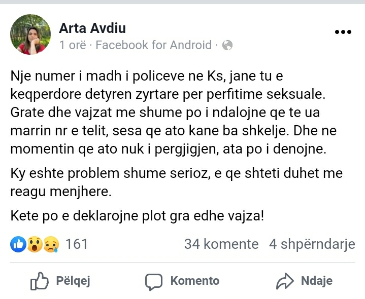 21-vjeçarja e nacionalitetit ashkali e cila po kryente marrëdhënie seksuale në një motel me një 61-vjeçar nga Gjakova, kur ky i fundit u alivanos dhe më pas vdiq, ka deklaruar në polici se me viktimën janë njohur disa ditë më parë ku më pas janë dakorduar që të takoheshin përsëri.